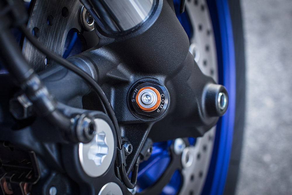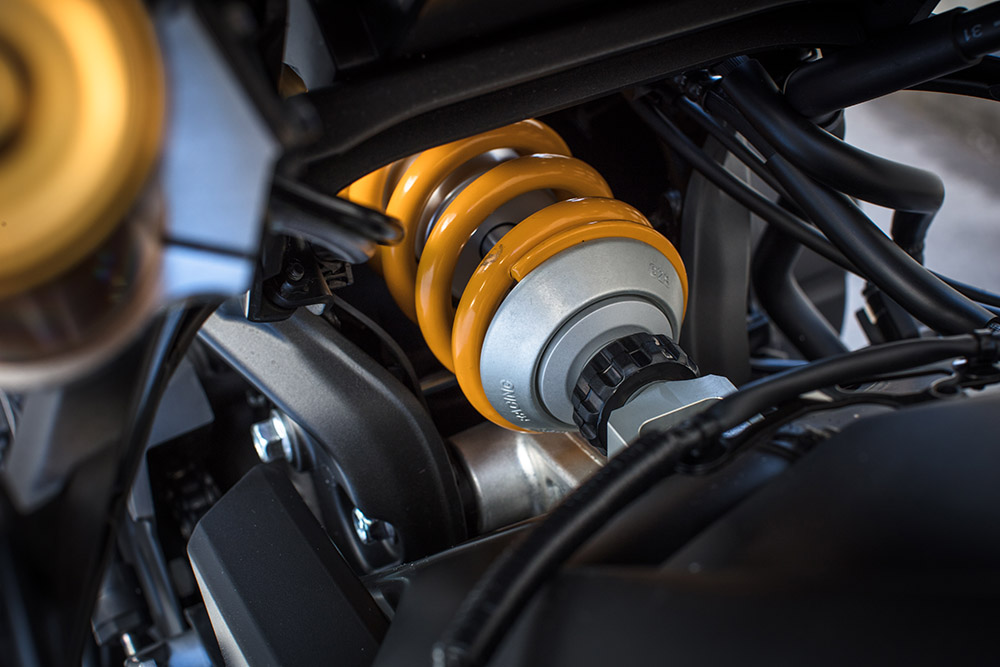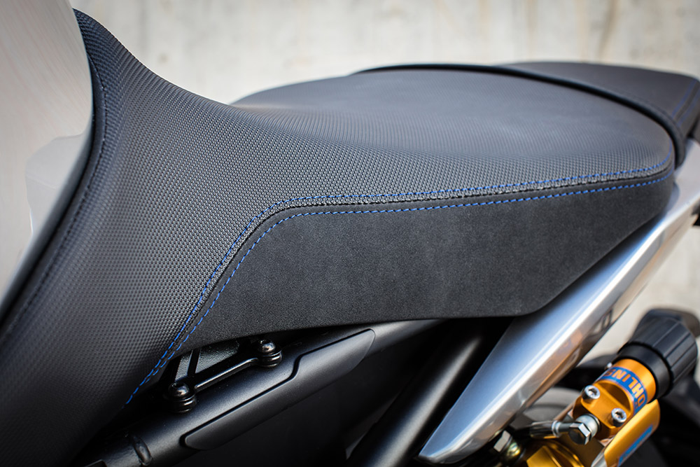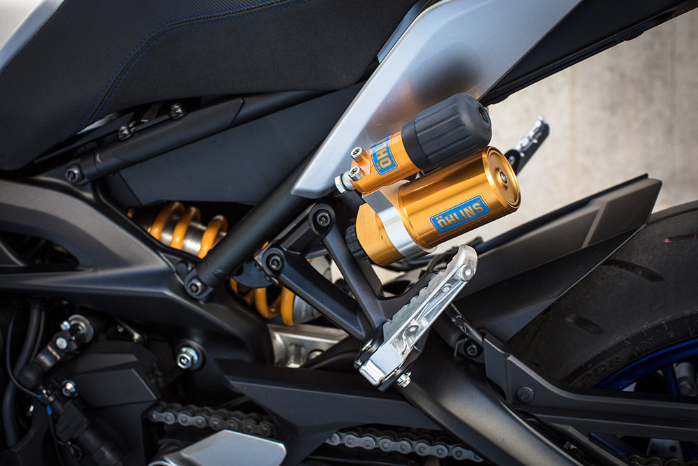 Com cerca de 1 100 euros passamos a ter um conjunto de suspensões totalmente ajustáveis. Trata-se de uma forquilha Kayaba na frente, com ajuste de pré-carga e compressão de alta e baixa velocidade em ambas as pernas. O amortecedor passa a ser um Öhlins, também completamente ajustável. O mostrador lcd apresenta-nos agora a informação em “branco” sobre um fundo negro, as manetes são negras, e o esquema de cores azul-prata-carbono, é a única opção.