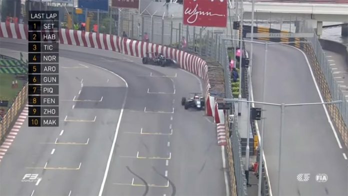 Depois de travarem um duelo muito interessante, que se prolongou mesmo à parte interior do circuito, onde todos os locais eram bons para quem seguia atrás se ‘mostrar’ ao líder. Mas este estado de espírito foi longe demais entre os dois pilotos, já que na entrada para as últimas reta, depois da zona sinuosa do circuito, Ferdinand Habsburg passou de forma muito audaciosa Sérgio Sette Câmara, na última direita de 90º imediatamente antes da meta, com os dois pilotos para lá dos limite dos monolugares, o que resultou mal para ambos já que o brasileiro perdeu a traseira e bateu de imediato nas barreiras e Habsburg saiu muito largo e também foi bater mais à frente, isto com a meta à vista.