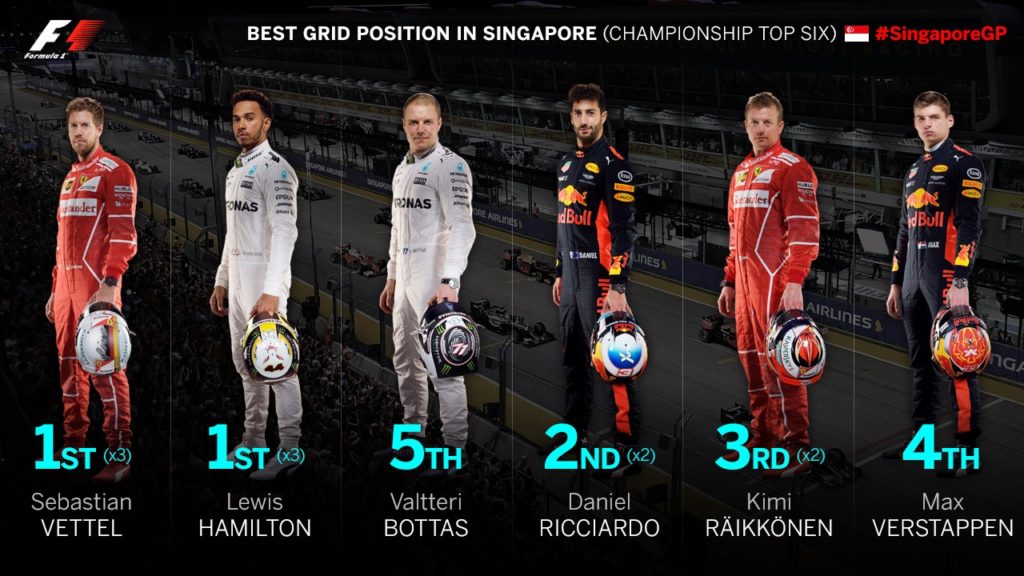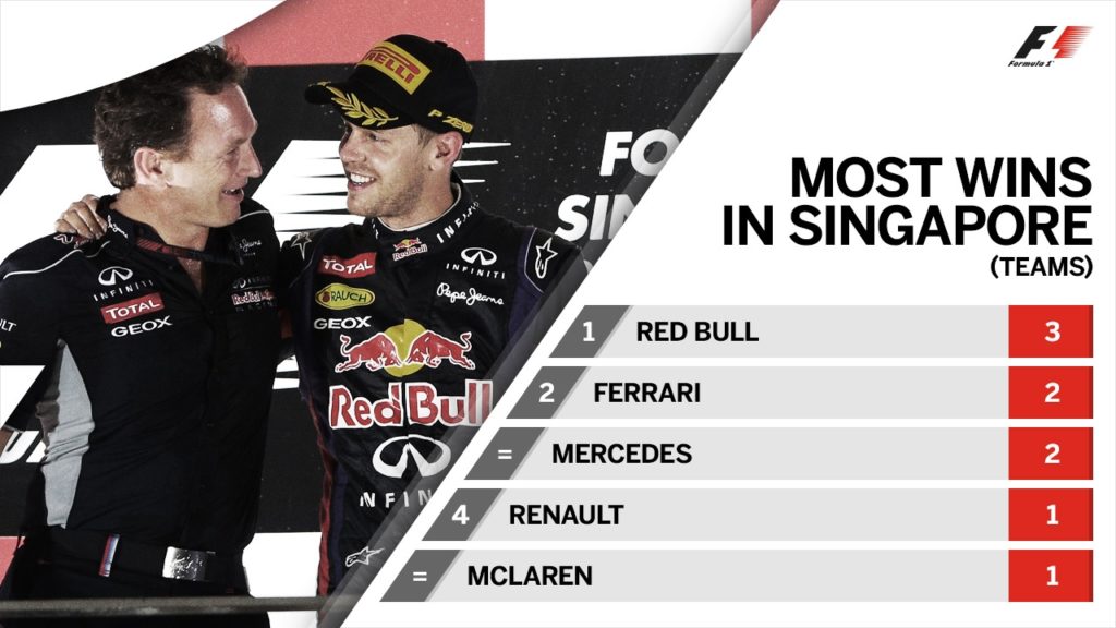 Mas será a Red Bull que tem a maior margem de progressão face ao que tem vindo a fazer, e temos que considerar a hipótese de contar com eles para vencer. O Red Bull dá-se bem melhor em pistas que exigem maior apoio aerodinâmico, sobretudo os circuitos citadinos, mas é no mínimo curioso que tenha sido no GP do Azerbaijão que a Red Bull tenha obtido a sua única vitória do ano até aqui. É verdade que foi um GP em que muita coisa aconteceu mas não deixa de ser significativo.Ricciardo tem um bom histórico em Singapura, e desde a primeira corrida em 2008, a Red Bull é a equipa que venceu mais vezes em Marina Bay, três vezes… com Sebastian Vettel. A Force India deve estar novamente muito forte e nesta corrida não deve ser a Williams a dar luta mas sim a Renault, sendo curioso perceber o que pode fazer Nico Hulkenberg, pois de Jolyon Palmer já não se deve esperar muito. A McLaren ‘promete’ colocar os seus dois carros na Q3,
