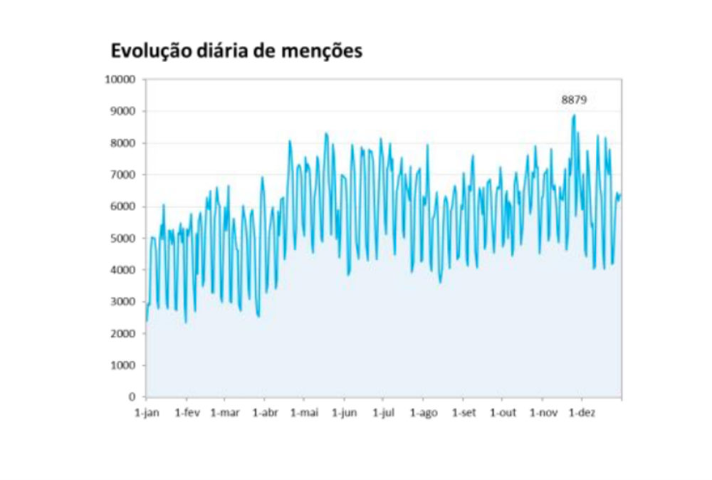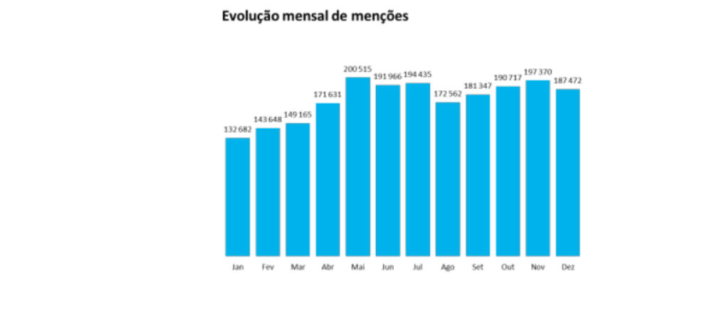 “Durante o ano, registou-se uma média de 5775 menções por dia a estas marcas, tendo-se observado um mínimo diário de 2341 menções, no dia 31 de janeiro, e um máximo de 8879 menções, no dia 25 de novembro, num dia em que MEO e McDonald’s foram as marcas mais mencionadas.” Já numa análise mensal, vemos que Maio foi o mês que contabilizou maior número de menções, superando as 200 mil, 9.5% do total anual.