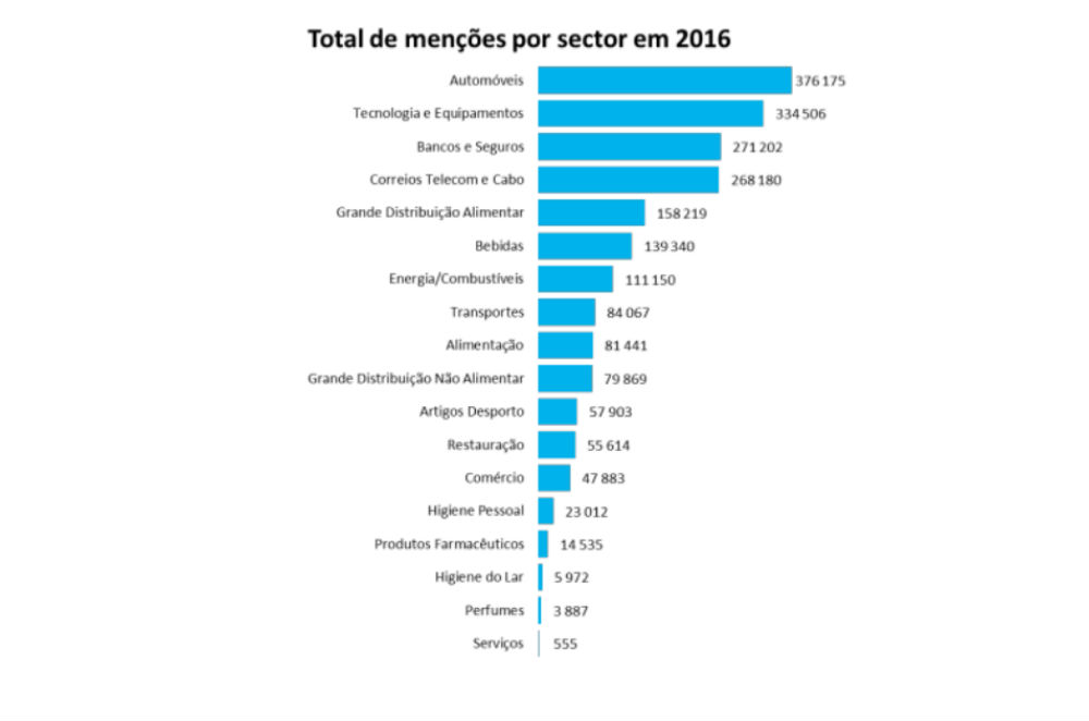 O referido estudo sistematizou a atividade nas redes sociais em 2016 através da recolha de “2 milhões de menções às marcas que compõem o seu painel fixo de marcas monitorizadas (denominado Barómetro de Marcas).”