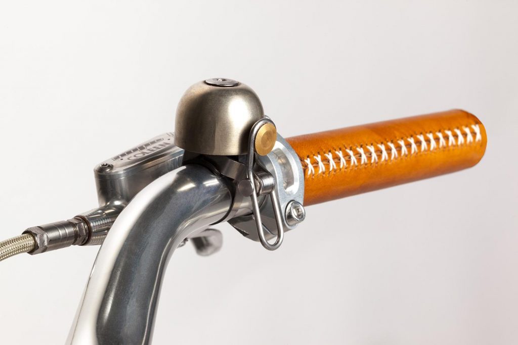 Graças ao quadro de fibra de carbono (1,9 kg), ao motor leve (2,5 kg) e bateria (2,7 kg), a bicicleta inteira pesa apenas 18 kg. O selim é de couro, feita pela marca Voltaire.