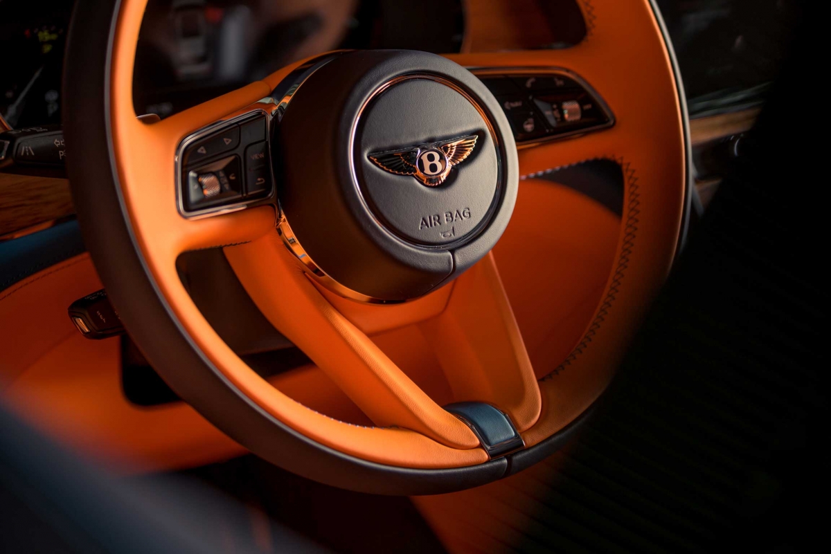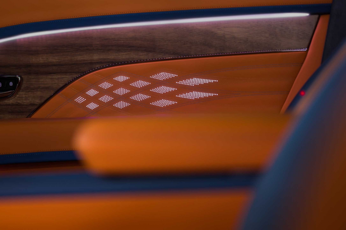 O interior deste Bentayga EWB único é tão deslumbrante como meticulosamente trabalhado, e os clientes passaram muitas horas a explorar a paleta de opções com Phill Dean. As suas escolhas incluíram a configuração de quatro lugares com a especificação de assento de avião da Bentley para os dois lugares traseiros, sistema áudio Naim e iluminação ambiente. No entanto, mais vibrante é a visão de luxo dos clientes, com um habitáculo numa combinação dramática de pele Mandarim e Imperial Blue. O folheado Open Pore Koa, leve, contemporâneo e sustentável, foi escolhido para o painel de instrumentos, a consola central traseira, revestimento interiores das portas e as mesas retráteis. Mas são os toques de pele Kingfisher que causam o impacto mais dramático, surgindo nos apoios dos bancos, no volante, na alavanca da caixa de velocidades e no revestimento das portas. A pele Kingfisher também se revela na superfície superior das mesas de piquenique quando abertas.