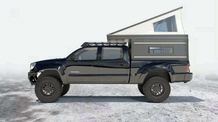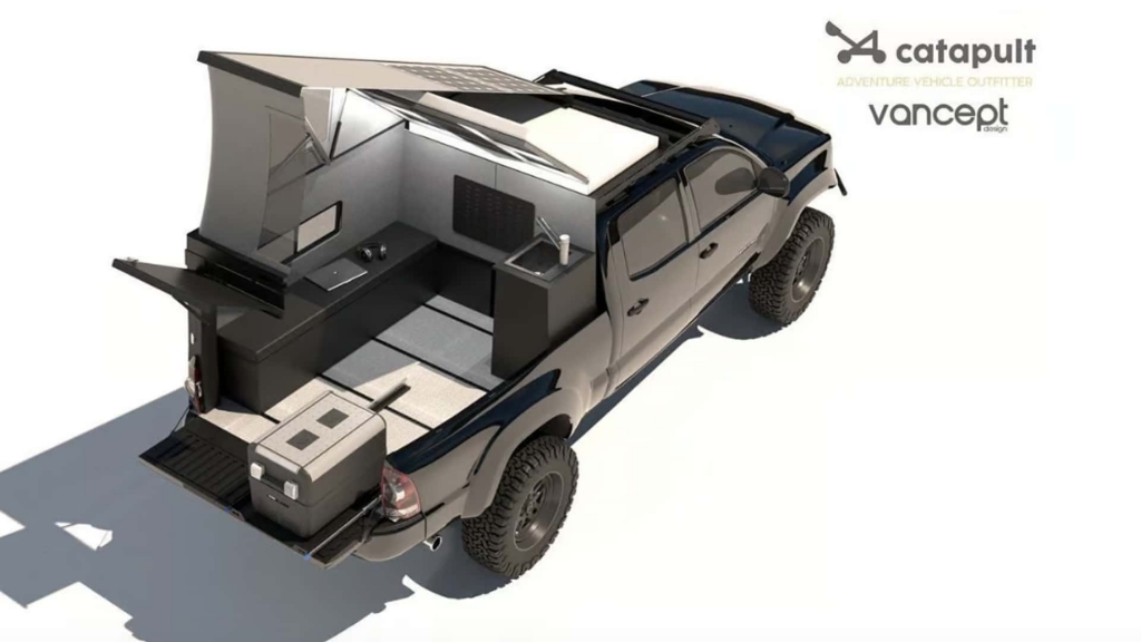Neste caso, analisámos um produto ligeiramente diferente. Trata-se de um módulo de campismo para pick-up, fabricado pela empresa especializada Catapult AV, especializada em caravanas. Por isso, queremos mostrar-lhe o seu mais recente projeto, que não é outro senão o referido módulo de habitação, nesta ocasião, instalado na cama de uma Toyota Tacoma, a pick-up que é vendida no mercado norte-americano.