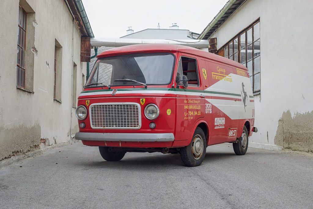 Mas, este Fiat 238 de 1973 é bastante diferente de todos os outros e mais especial, foi encomendado novo pela Garage Francorchamps para a assistência dos seus modelos Ferrari. O melhor de tudo é que a decoração é toda pintada à mão, incluindo os emblemas dos modelos da marca de Maranello.