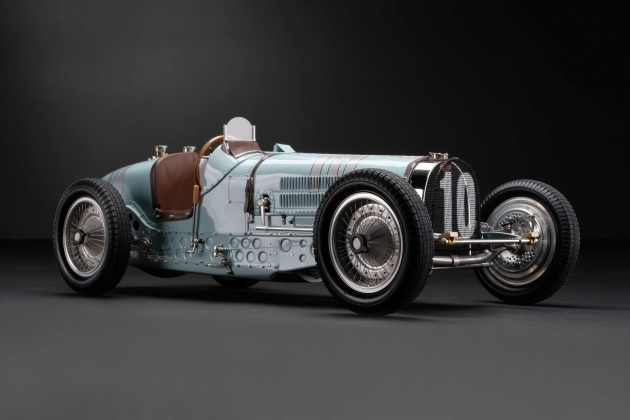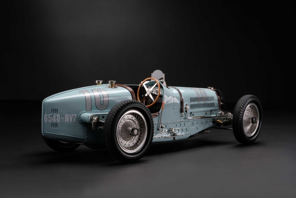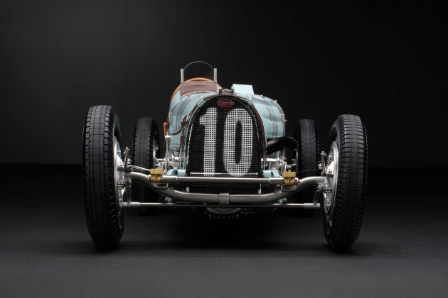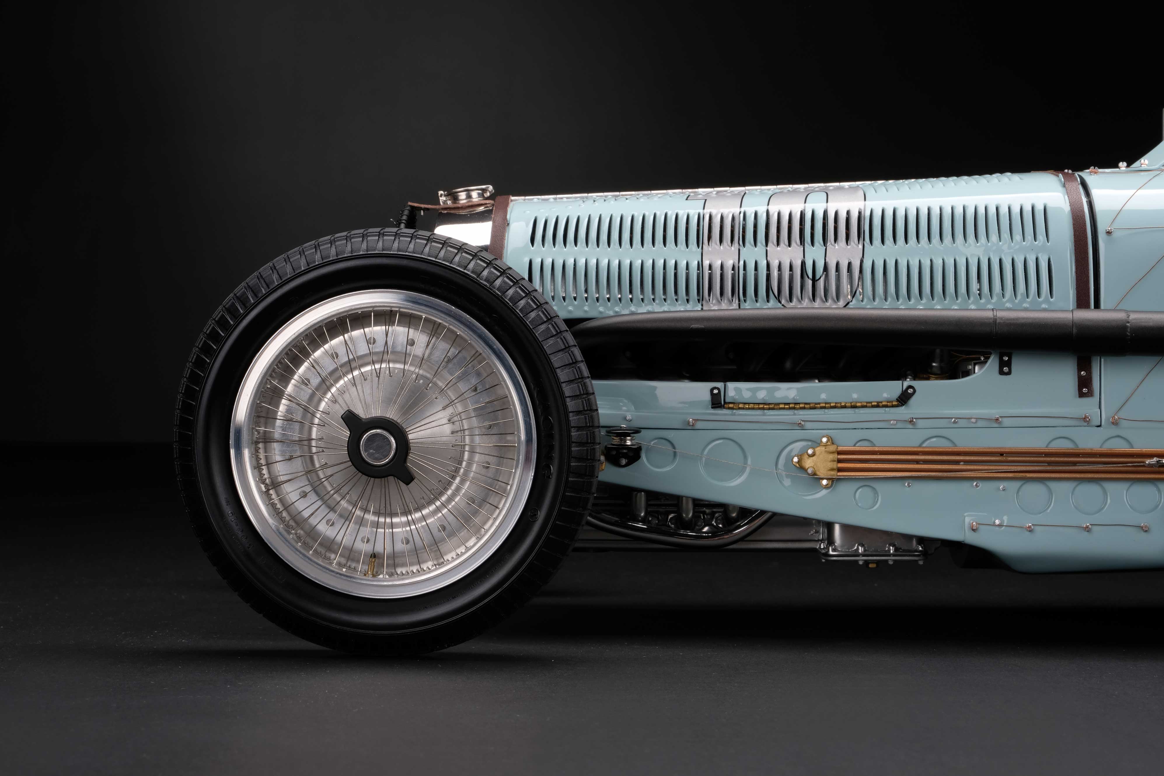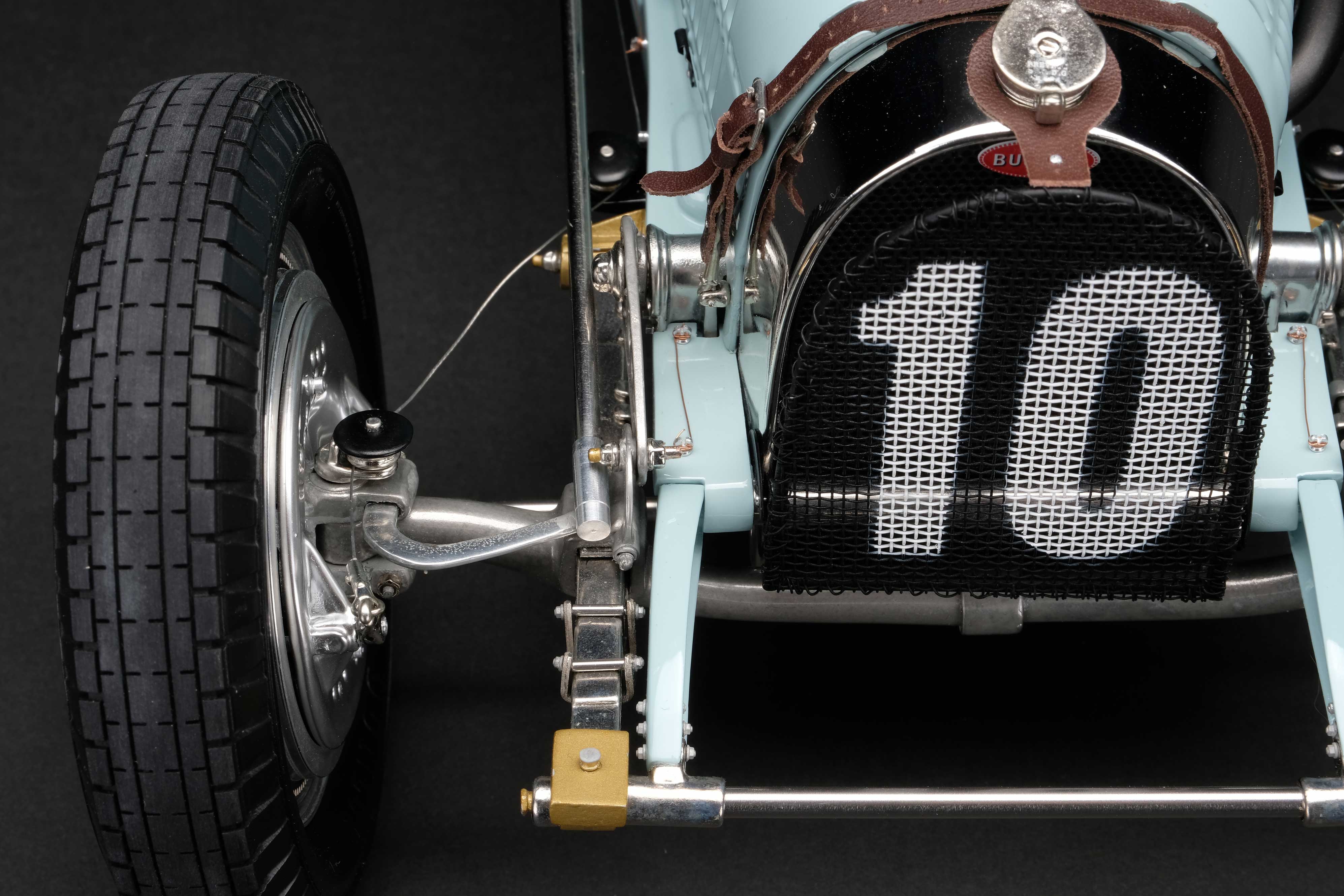 Cada detalhe visível do automóvel tal como este competiu em Spa em Julho de 1935 foi capturado e perfeitamente replicado, usando imagens e dados de arquivo, partilhados pela Bugatti e pela Bugatti Trust. O modelo apresenta uma cobertura do motor completamente removível que é fixada ao modelo com correias de couro em escala, exatamente como o carro original, sob a qual se encontra o motor sobrealimentado de oito cilindros em linha de 3,3 litros. Cada detalhe minucioso foi capturado, desde o padrão no painel de instrumentos, até às ligações dos travões por cabo e às rodas de cordas de piano perfeitamente projectadas. Cada roda é em si mesma uma obra de arte, com mais de 80 peças, exigindo várias horas de trabalho de montagem precisa.