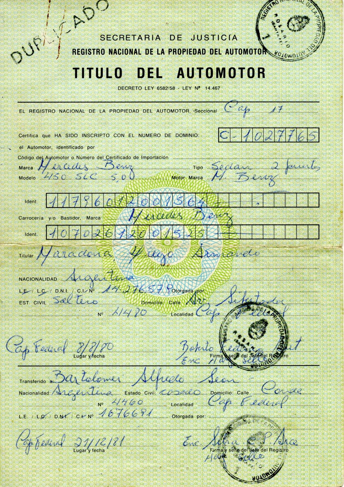 Maradona recebeu o seu Mercedes-Benz 450 SLC 5.0, em 1980, pelo próprio Juan Manuel Fangio, que era o responsável pela distribuição da Mercedes-Benz na Argentina, pintado na cor Signal Red, a cor do seu clube.