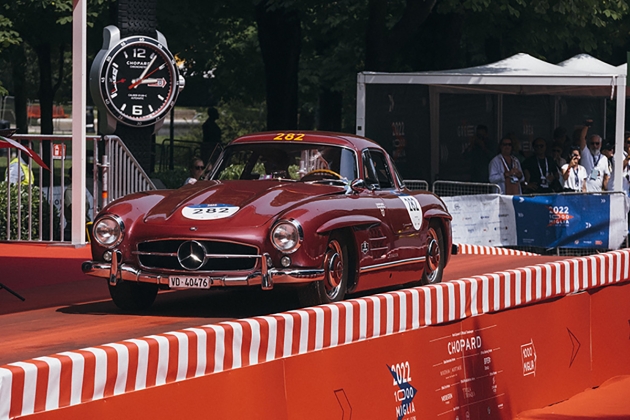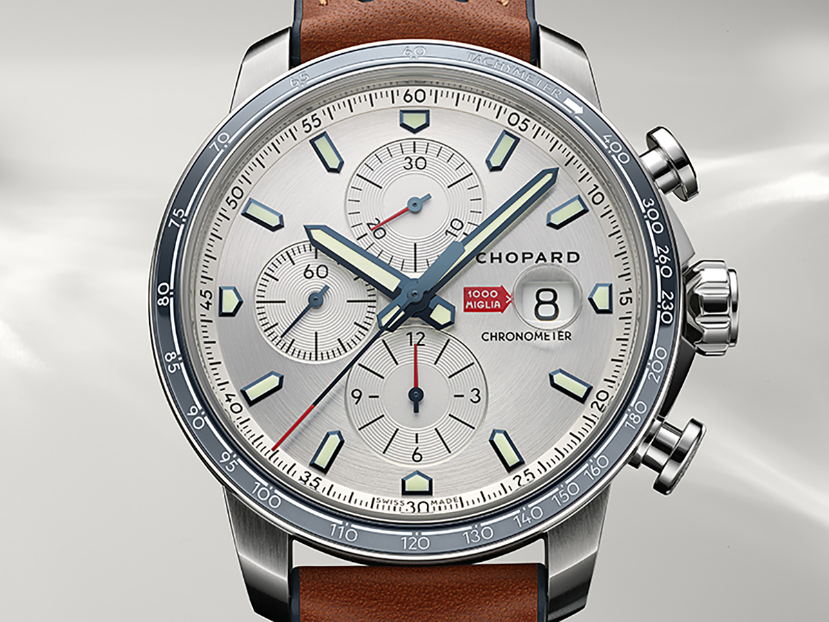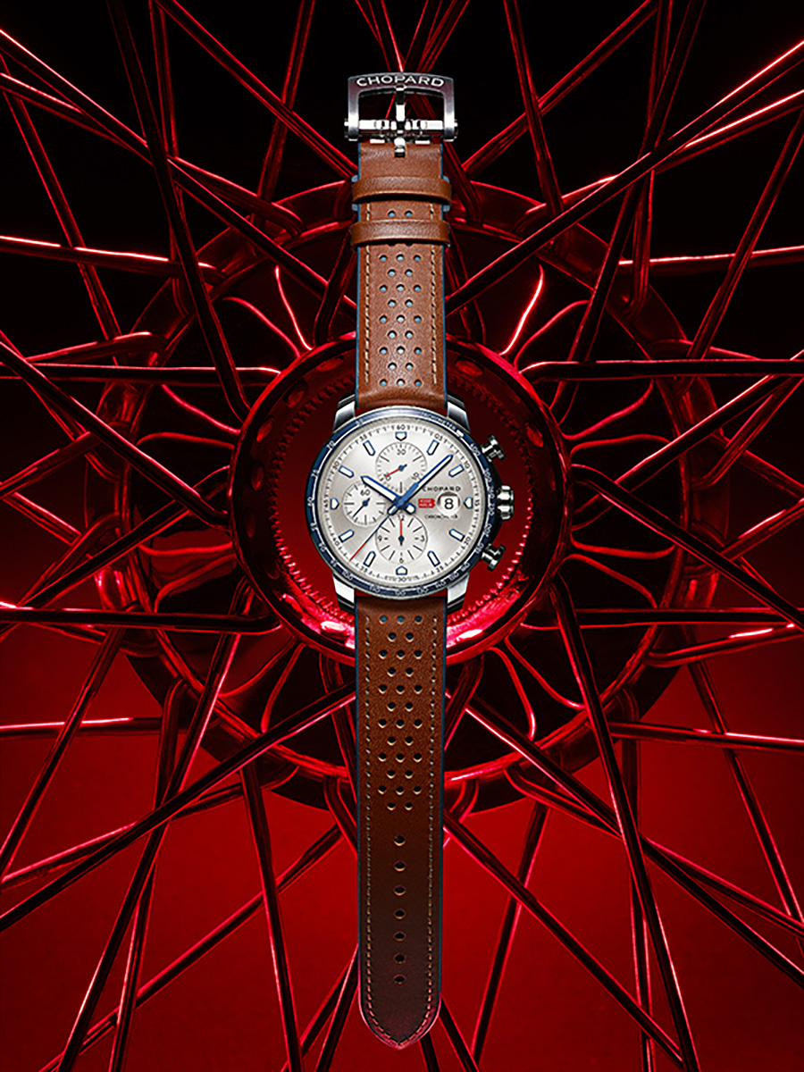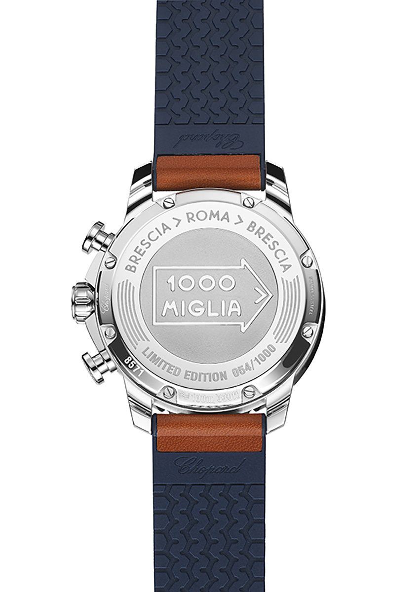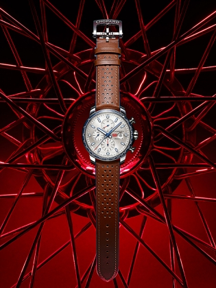 A emblemática colecção de relógios da Chopard aparece vestida de cinza e azul de forma a homenagear uma das mais prestigiada corridas de clássicos ,de estrada aberta. Os novos relógios de 44mm, em ouro rosa, com 18 quilates com versões disponíveis em aço inoxidável ou totalmente em aço.
