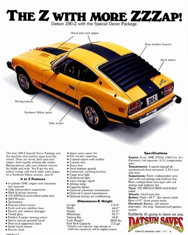 Em 1977 a Datsun lançou uma edição limitada a 1.000 exemplares designada ZZZAP. Todos os exemplares eram pintados na cor Sunshine Yellow, com uma decoração especifica, espelhos retrovisores mais desportivos e “persianas” no vidro traseiro. Esta edição especial serviu para promover a máquina de arcade designada Datsun 280-ZZZAP, sendo a primeira vez na história automóvel que existia uma edição especial dedicada a um videojogo.