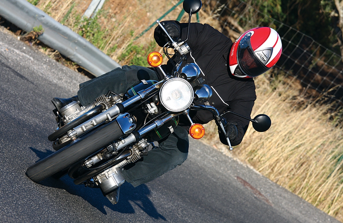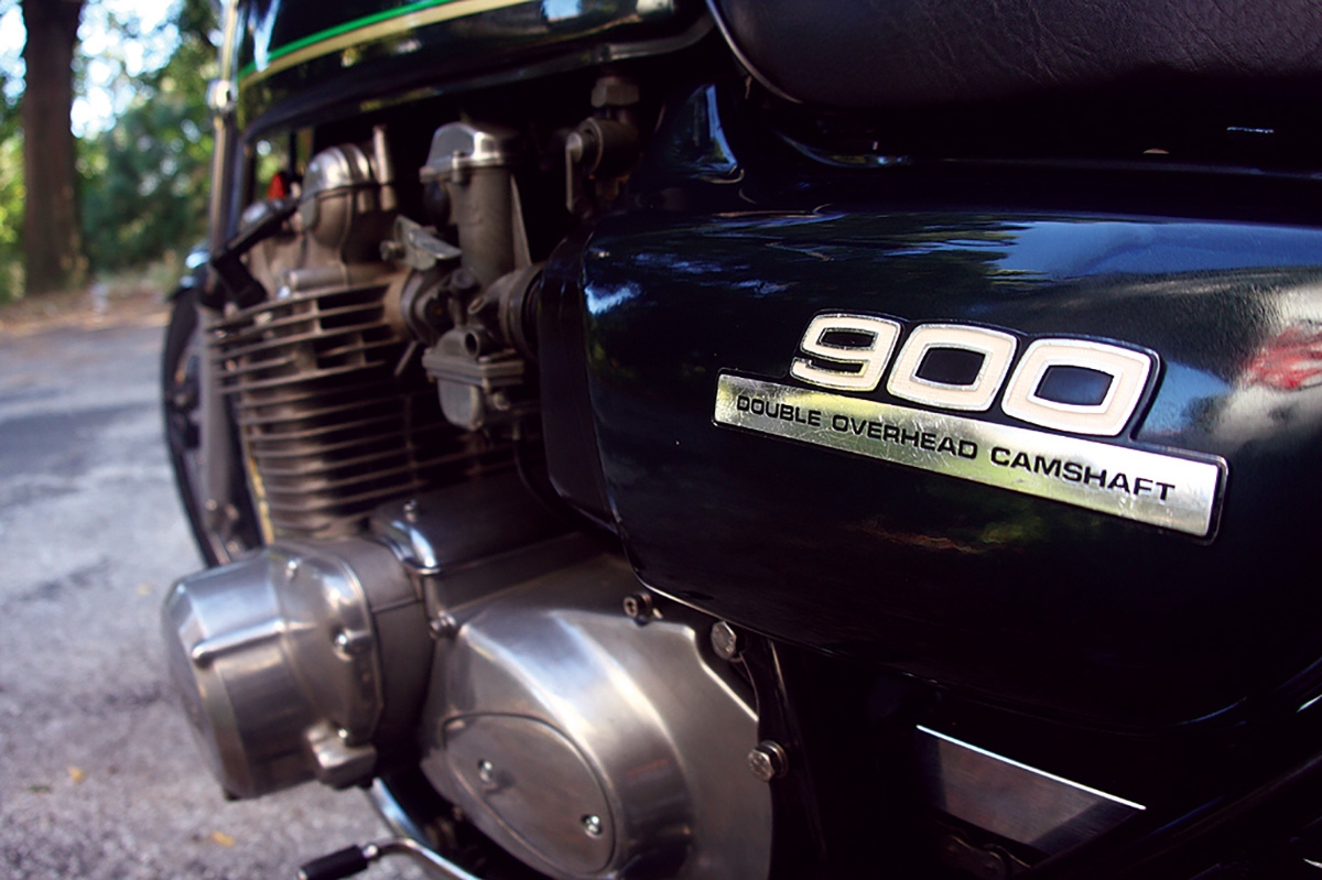 Após algum cuidado, o grande motor arranca facilmente, instalando-se naquele ralenti roufenho que fala de potência desconhecidas para o mundo quando a moto saiu em 1972, ecoado através dos magníficos 4 silenciadores curvos. Assim que se fecha o ar, o barulho é de todo mais suave e com a moto quente, pode-se pôr a trabalhar dando com o “kick” à mão, tal o equilíbrio primário do grande quatro em linha de 903cc. Um dos segredos da lendária fiabilidade do motor, que foi utilizado em tudo desde sidecars a dragsters e especiais pelo mundo fora, será o formato quadrado de 66 x 66mm, na altura pouco habitual, ajudando a ganhar rotação sem atingir velocidades lineares excessivas do pistão. Tudo na moto é grande, embora a largura do depósito seja elegante para algumas motos de hoje, vamos sentados bastante alto e muito direitos com os guiadores abertos que em tantos modelos não tardariam em ser substituídos por avanços. Do mesmo modo, os quatro escapes, agora preciosos, eram invariavelmente descartados em favor de sistemas 4-1. O ganho de peso era considerável, o “look” era mais desportivo e de qualquer maneira era só uma questão de tempo até os de origem enferrujarem por dentro e abrirem grandes buracos…Os comandos exigem uma mão de homem, a embraiagem é pesada e o disco da frente, funcionando sem ser brilhante, também exige um bom aperto da manete. Em andamento, a estabilidade é excelente, só em curvas mais pronunciadas se nota alguma incerteza dos amortecedores duplos, sempre o calcanhar de Aquiles das motos desta época, aliados a quadros muito finos e garfos que hoje pareceriam pobres numa 125.