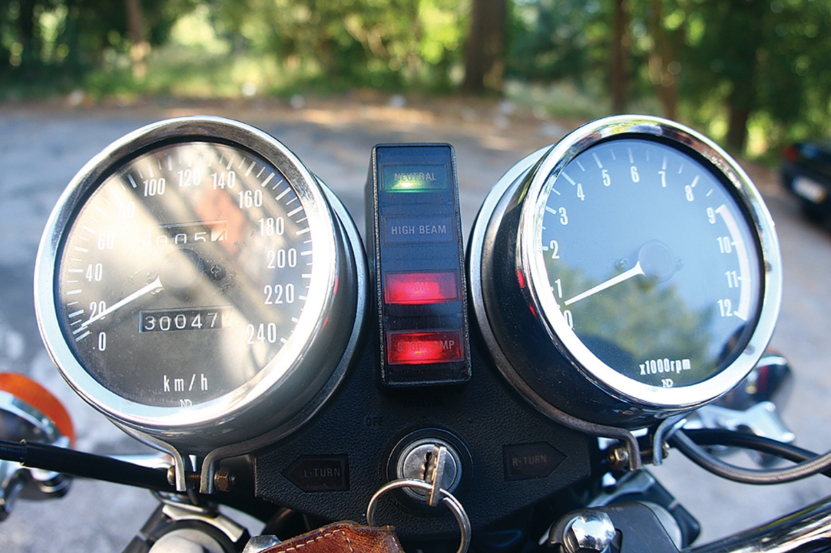 Interessante para a época detalhes que vamos recordando, a moto tinha já um indicador de stop na consola que confirma estarem as luzes de stop a funcionar, e um manípulo de luzes de emergência montado nos guiadores, se bem que este parece um ideia de última hora, montado como um apêndice neste primeiros modelos. Os grandes instrumentos montados em copos cromados eram outro ponto distinto do modelo, infelizmente também amachucavam em colisões. Os comutadores também têm um repetidor sonoro – “nhec, nhec, nhec” que era a primeira coisa que muitos donos desligavam, mas marcava a diferença para as rudimentares inglesas da época, onde uma luz de neutro já era considerada pieguice! De facto, para a época a moto era cheia de detalhes bem pensados, como uma bandejinha sob a cauda que deslizava para guardar os documentos, outra peça quase sempre perdida ao fim de um par de donos e tampão de gasolina accionado por chave.