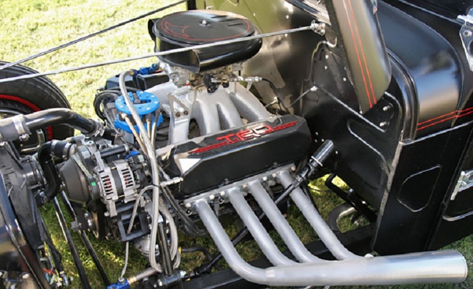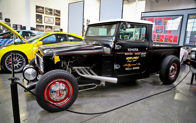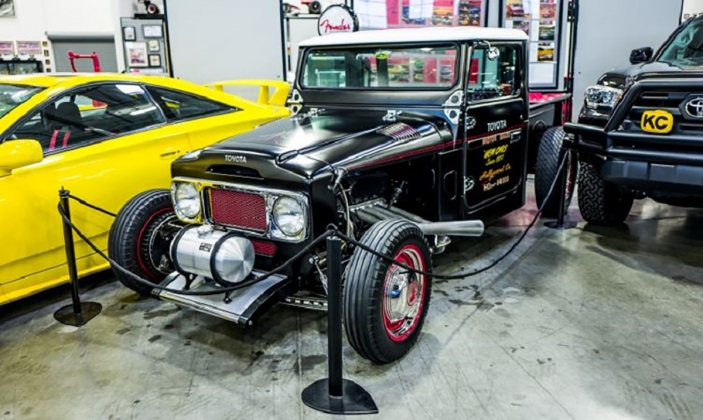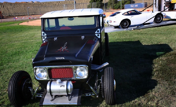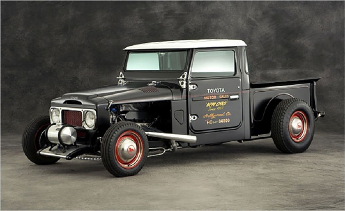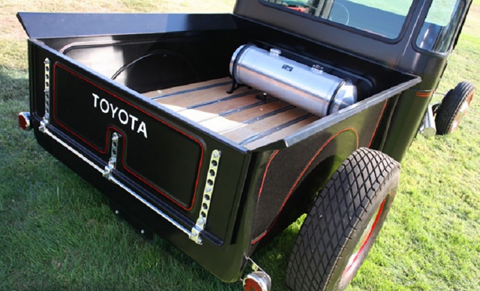 No geral, a carroçaria foi rebaixada e estreitada e a caixa de carga foi produzida toda à mão, onde tem o tanque de combustível da Mooneyes, tudo para assentar melhor no chassis modificado. A cor exterior é preta mate, e confere ao automóvel um ar mais dramático, contrastando com o vermelho das jantes.