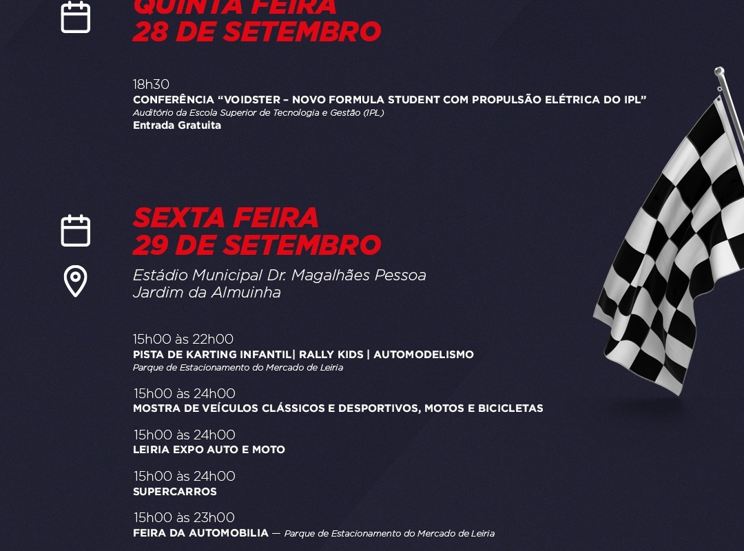Na Sexta-feira, dia 29, há pista de karting infantil, mostra de veículos clássicos e desportivos, motos e bicicletas, feira de automobilia e o Leiriamotorshow. As atividades começam às 15 horas. Além da mostra de carros, da pista de karting e da feira de automobilia, chegam a Leiria, no Sábado, dia 30, várias concentrações e passeios de carros. Há ainda passeio de bicicletas antigas, passeio de mini hondas e de vespas.