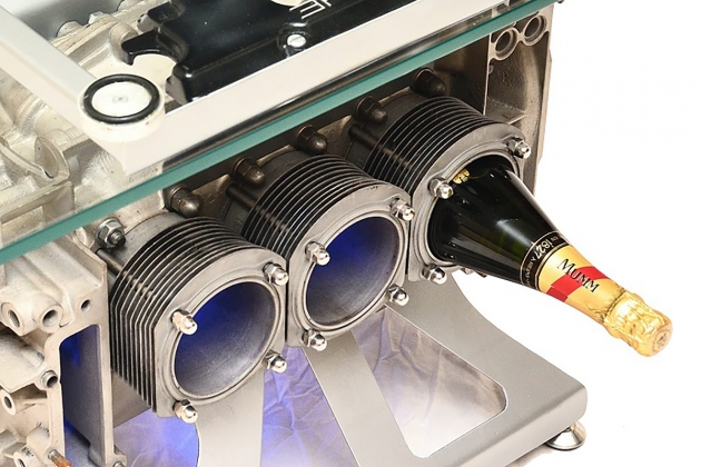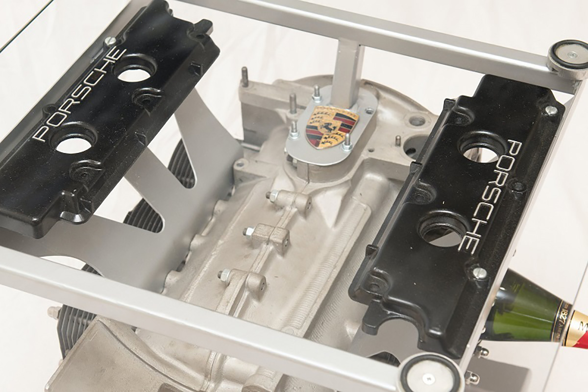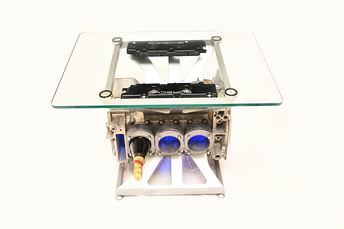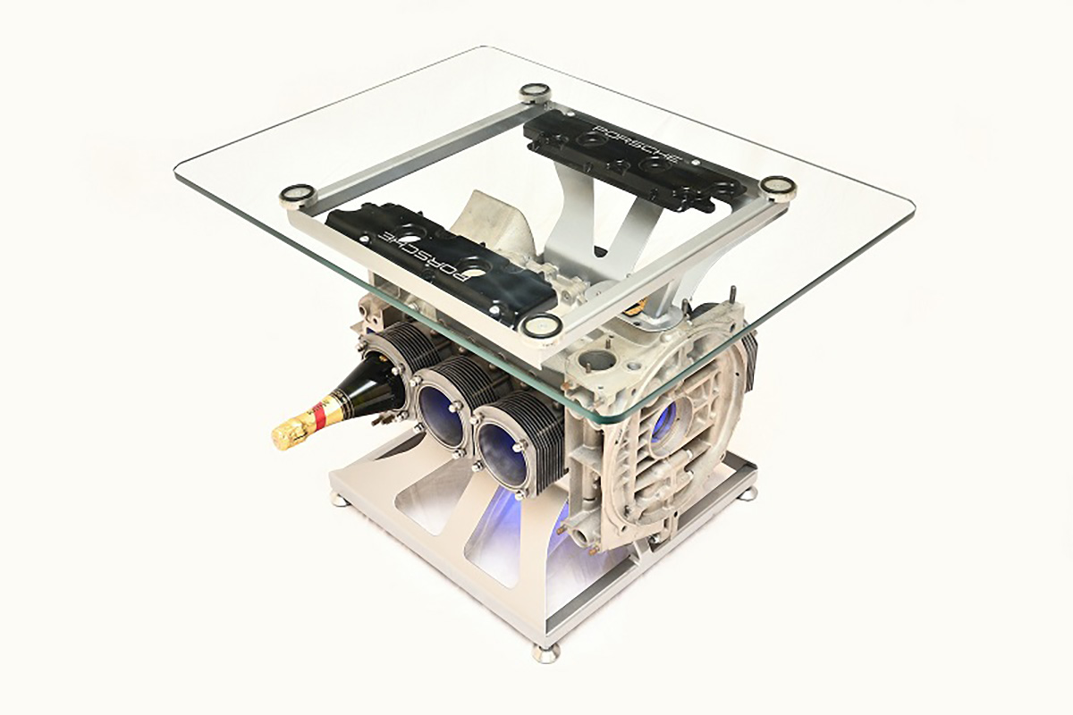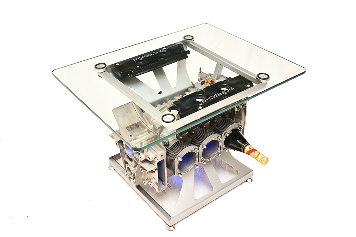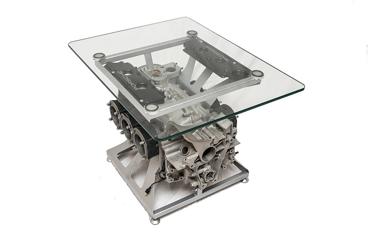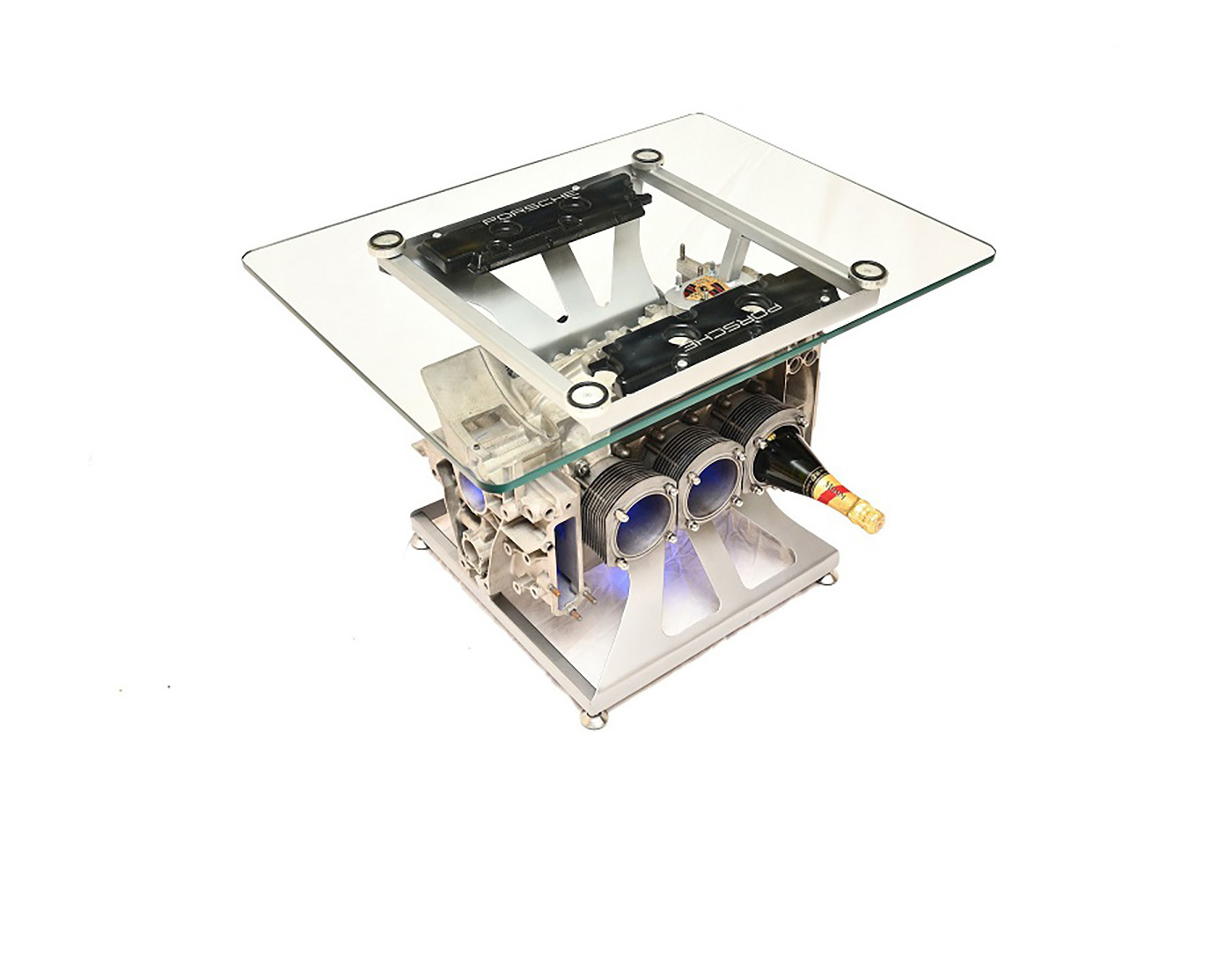 Esta mesa utilizou um motor original boxer de seis cilindros retirado de um Porsche 911 Carrera 2.7, de 1974. A ideia para esta construção partiu após o motor ter sofrido uma avaria irreparável, problema crónico nestes motores e, ao invés de ir para a sucata, foi reaproveitado para decoração. As tampas das válvulas que servem de suporte ao vidro foram retiradas de um 911 T. No seu interior tem iluminação LED de várias cores, para poder ser apreciado todo o interior do motor, assim como para dar mais vida à peça.