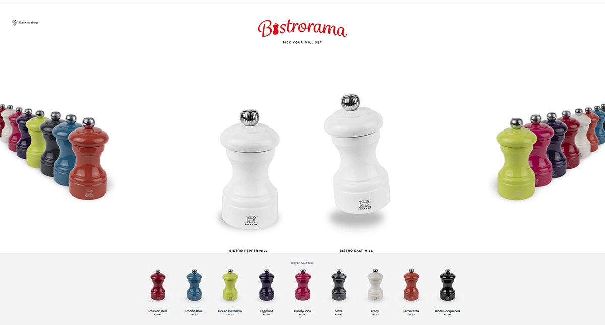 A Peugeot Saveurs, a divisão gastronómica da Peugeot, decidiu lançar a coleção Bistrorama. Modernizou o visual exterior dos seus moinhos manuais originais, que foram lançados pela primeira vez no século XIX, com dez centímetros de altura e estrutura em madeira, com uma nova palete de cores trendy.