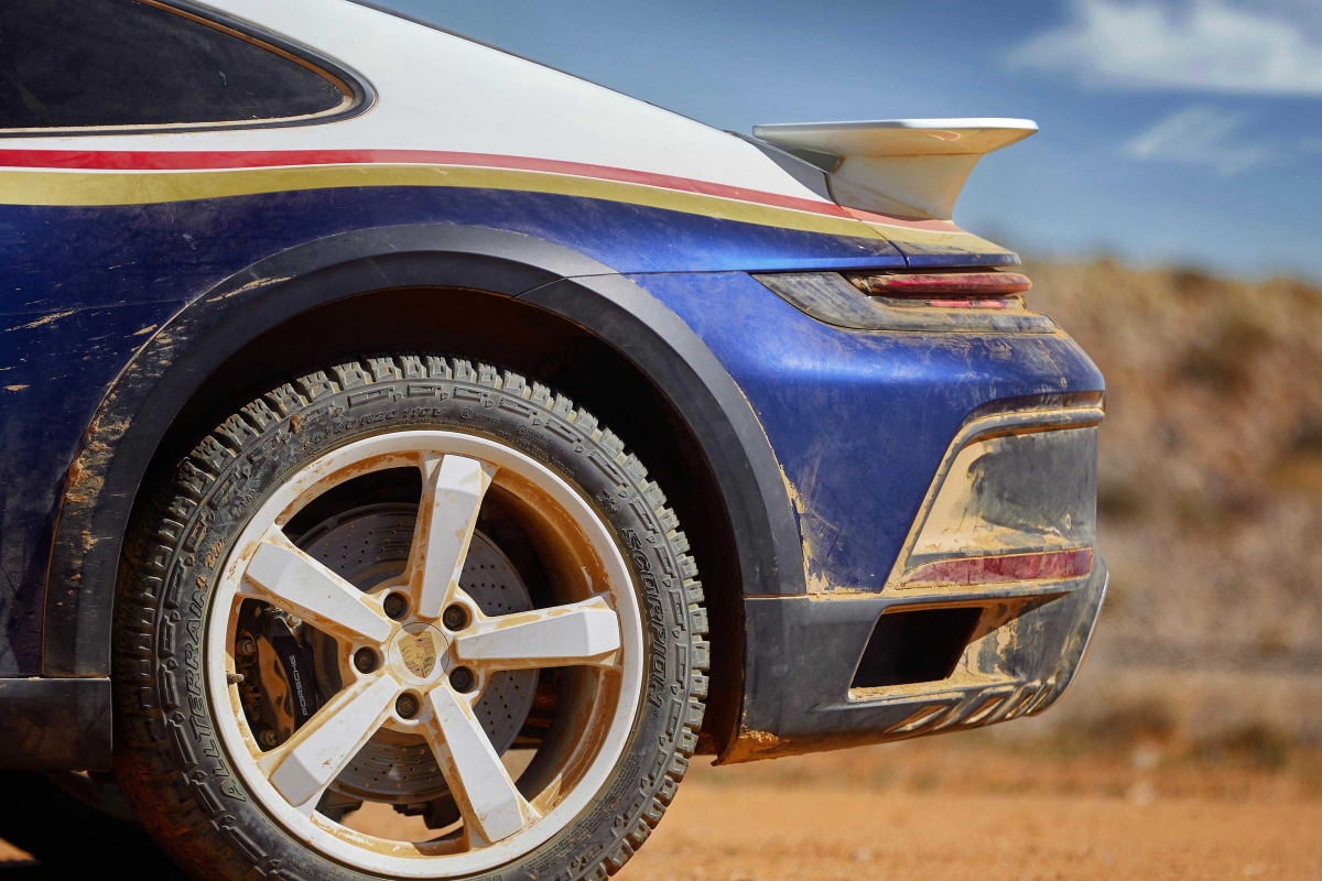 Os atributos todo-o-terreno deste desportivo são complementados pelos pneus Pirelli Scorpion All Terrain Plus (245/45 ZR 19 à frente e 295/40 ZR 20 atrás). Os pneus especialmente concebidos apresentam uma banda de rodagem volumosa, com nove milímetros de profundidade, e paredes laterais reforçadas. Assim, os pneus do 911 Dakar são ideais mesmo para terrenos difíceis e são bastante resistentes a possíveis cortes. Os pneus Pirelli P Zero de Verão e Inverno também estão disponíveis como opção. No entanto, os pneus todo-o-terreno são de série e oferecem uma dinâmica desportiva também em estrada.