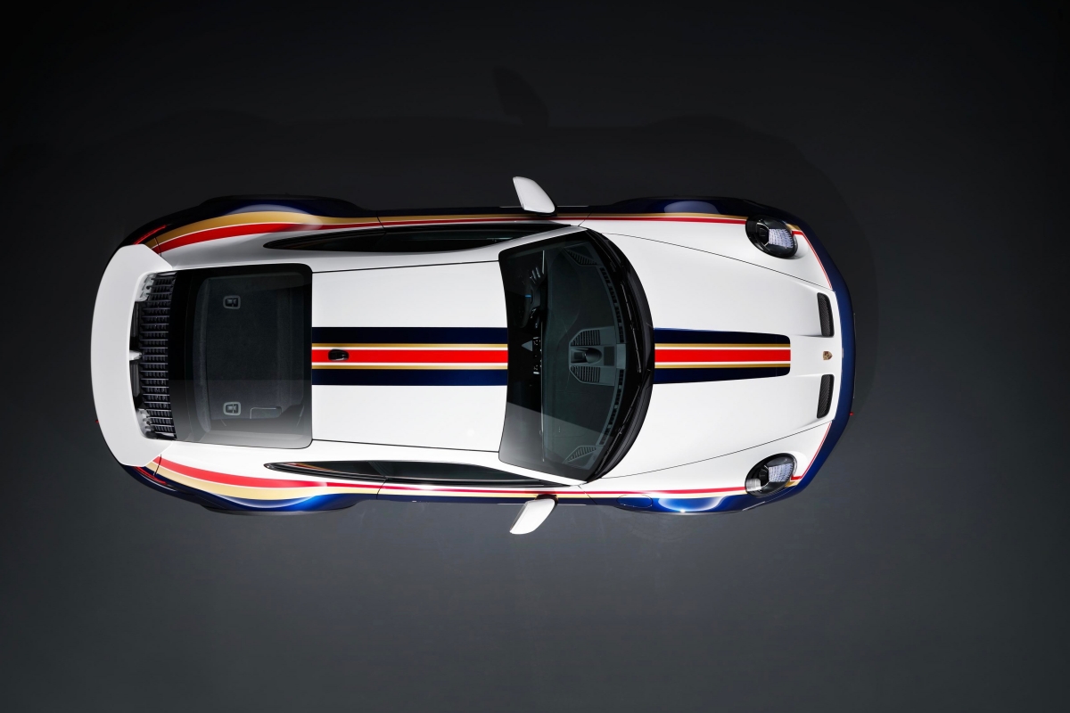 A base do Pacote Rallye Design da Porsche Exclusive Manufaktur, disponível como opção, é o acabamento bicolor em branco e azul gentiana metalizado. A Porsche implementa, pela primeira vez num modelo de produção em série, a combinação de uma pintura bicolor e películas decorativas. Nas portas, os clientes podem selecionar um número entre o 0 e o 999. Para além das faixas em vermelho e dourado, o 911 Dakar com o Pacote Rallye Design, que tem um visual baseado no veículo vencedor do Rali Paris-Dakar de 1984, também conta com a inscrição “Roughroads” nas portas. O termo é uma marca registada e reflete o conceito do 911 Dakar e as suas aptidões para todo-o-terreno. As jantes pintadas em Branco e a faixa de luz traseira em Vermelho completam o aspeto diferenciador. Outros destaques que podem ser encontrados no interior: pacote de equipamento alargado em Race-Tex e Pele, bem como cintos de segurança e detalhes em azul tubarão.