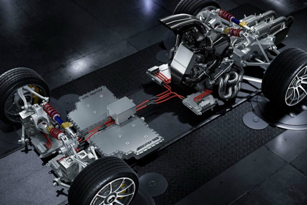 As 24 Horas de Nurburgring foram o palco escolhido pela marca para dar a conhecer o “coração” que vai fazer bater furiosamente o Mercedes Project One e cujas especificações causam arritmias e fazem sonhar todos os fãs dos superdesportivos. Na base estará o motor V6 1.6L que a marca tem utilizado na Fórmula 1 e com 730CV, que contará com o suporte de um turbo elétrico, o que significa que ele estará sempre disponível para funcionar na capacidade máxima ao ser requisitado. Além disso, destaque para as placas cinzentas da foto com a sigla AMG, que correspondem às baterias responsáveis por alimentar os dois motores elétricos na dianteira. E como esta máquina de sonho deve recorrer ao sistema KERS da F1 para regeneração de energia, eletricidade nas baterias de iões de lítio é o que não vai faltar.