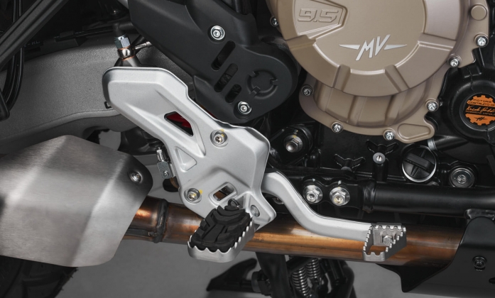 O motor é arrefecido a líquido e a cambota é contra-rotativa, uma solução técnica única na sua categoria e pela qual os três cilindros da MV Agusta sempre se destacaram, desde a apresentação do primeiro modelo de 675 cc. Isto traduz-se numa condução muito melhorada, com a inércia reduzida a facilitar as mudanças de direção. A vibração foi ainda mais reduzida com o contra-eixo, enquanto a embraiagem hidráulica assegura um funcionamento suave mesmo em condições de condução extremas. O sistema de escape foi concebido e desenvolvido para otimizar o desempenho do motor 950 e intensificar o som agressivo.