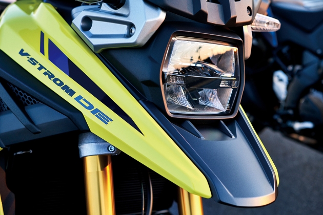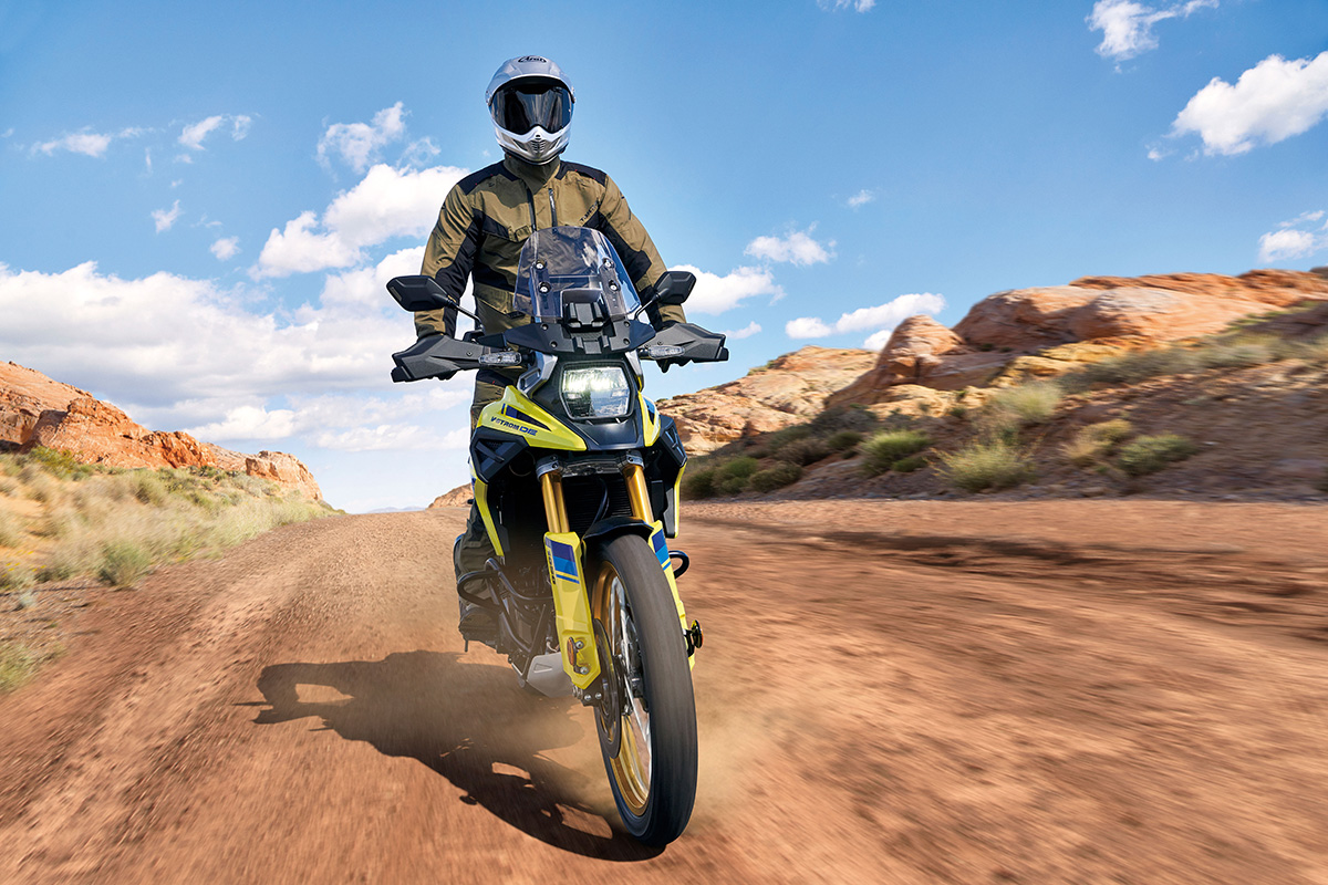 Assim a reputação da V-Strom com uma das melhores e mais sólidas opções do mercado no segmento das Trail para longas tiradas em estrada, sai agora reforçada com o alargamento do campo de utilização fora de estada na sua versão DE, que apresenta como principais atualizações: nova roda dianteira raiada de 21” em conjunto com um maior “trail” e distância entre eixos, que conferem maior controlo em superfícies não pavimentadas; maior curso da suspensão traseira e dianteira; guiador e apoios de pés mais largos; proteção de carter em alumínio; introdução de um modo “G” (gravilha) de controlo de tração no SIRS; ABS na roda traseira desligável.