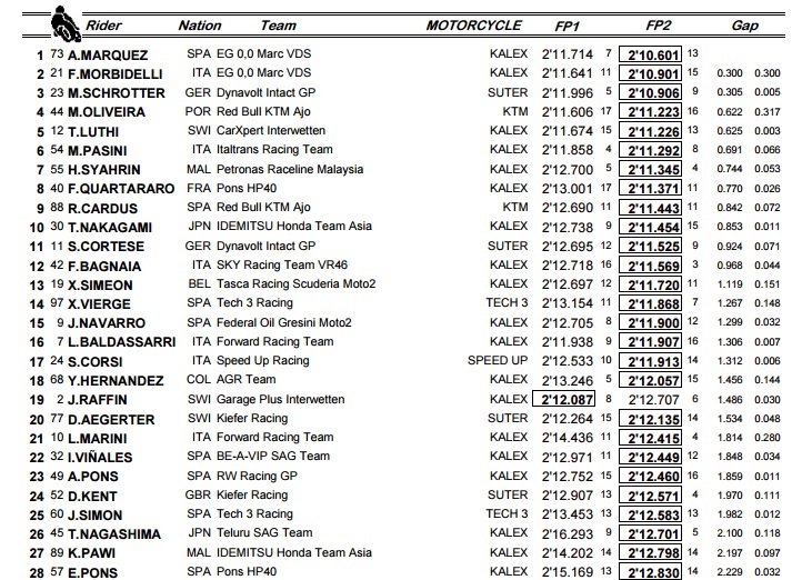 Quanto ao melhor tempo este ficou nas mãos de Álex Márquez, que rodou em 2m10.601s e deixou o seu colega de equipa e segundo classificado, Franco Morbidelli a 0.300s. Mais uma vez os homens da Marc VDS mostraram toda a sua rapidez e colocam-se como é natural no lote dos principais candidatos a conquistar a pole position amanhã. De salientar também o bom terceiro lugar de Marcel Schrötter, último piloto a rodar no segundo 10 e que exibiu a competitividade da nova Suter. Veremos se mantém a consistência amanhã, algo que tem faltado nos fins de semana de competição anteriores. Thomas Lüthi sempre regular foi quinto apesar de já ter ficado a mais de meio segundo de Álex Márquez.