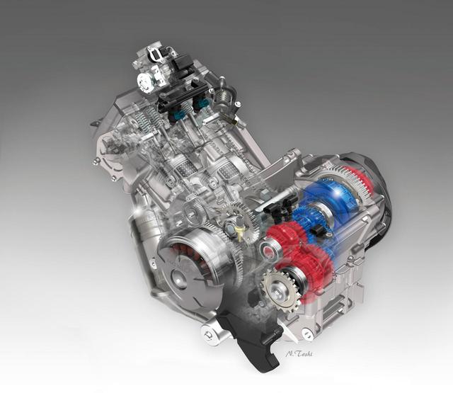 Motor: Bi-cilindrico paralelo, SOHC, com refrigeração líquida, cilindrada de 745cc, com 4 válvulas por cilindro, Taxa de compressão10,7:1, Potência max. De 54CV às 6.250rpm, Binário max. de 68Nm às 4.750 rpm, Arranque eléctrico, Capacidade de óleo 4,1 litros, Capacidade de combustível 13,1 litros, Embraiagem hidraulica multi-disco em banho de óleo, DCT com dupla embraiagem hidraulica, Caixa de 6 velocidades, Transmissão final por corrente, Quadro tipo diamante em aço