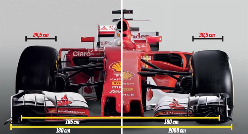 As duas áreas chave afetadas pelo regulamento são os pneus e o chassis. Os carros vão passar a ter bem maior contacto com o chão, fruto dos pneus que aumentam 25 por cento de largura; os da frente passam de 245 para 305mm; e na traseira, de 325 para 405mm; com o diâmetro a ser também ligeiramente incrementado. A largura dos monolugares passa de 1800 para 2000 mm; a asa dianteira também ‘alarga’ para os 1800 mm, ao invés de 1650 mm; e o nariz do carro prolonga-se um pouco. A asa traseira é mais baixa, passa de 950 para 800 mm, e passa a ser 150 mm mais larga. Para completar um conjunto que visa gerar bem mais apoio aerodinâmico, os difusores serão maiores, mais largos e compridos, tendo portanto a capacidade de ‘soprar’ mais ar. Os flancos são alargados de 1400 para 1600 mm. Com estas novas dimensões o peso do conjunto foi ajustado de 702 para 728 Kg. Como se percebeu pelos testes de Barcelona, há diversas zonas do traçado que são agora feitas com o acelerador a fundo e comparando o registo da pole-position de Lewis Hamilton no último GP de Espanha, 1m22.000s, Kimi Raikkonen registou no último dia dos testes, 1m18.634s – foi cerca de 3.5s mais rápido. E isto ainda agora começou…