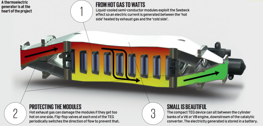 A ideia passa por transformar o calor emanado pelo escape em eletricidade, tirando proveito de energia que de outra forma seria dissipada. Segundo é explicado, isto permite gerar, num motor a gasolina, 300 watts de corrente a utilizar nos sistemas auxiliares do motor elétrico. O resultado é um aumento de 5% na eficiência. Algo que em termos de consumos pode não ser mais do que um decilitro de combustível a menos, mas que na luta das emissões pode ser bastante importante.