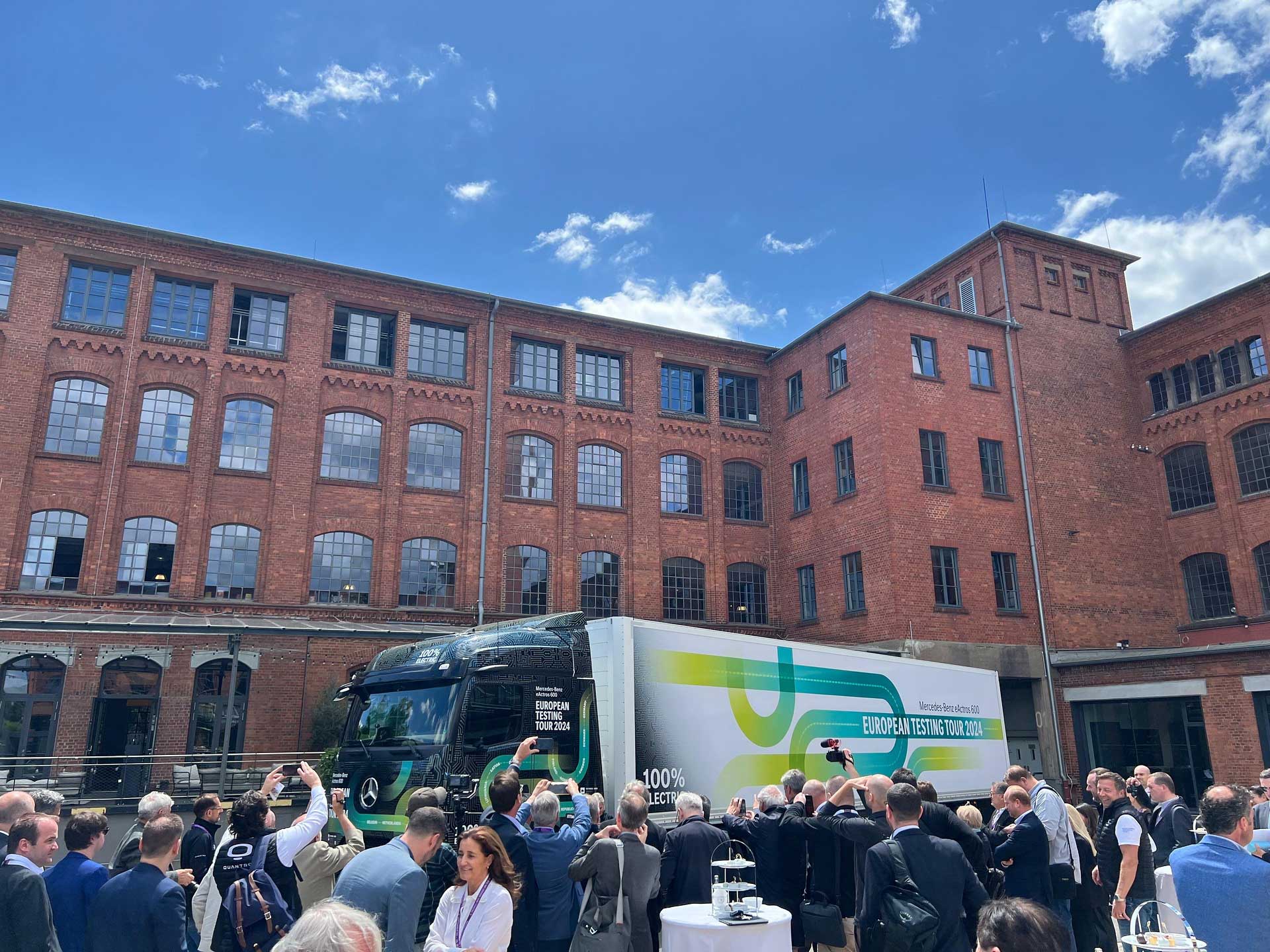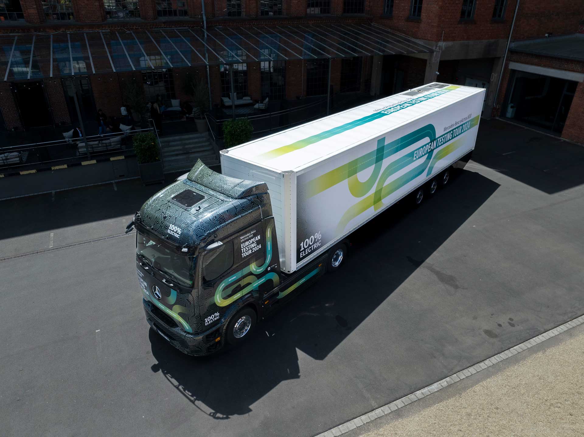 Einer der beiden seriennahen Prototypen des neuen Elektro-Flaggschiffs Mercedes-Benz eActros 600, die im Rahmen der „eActros 600 European Testing Tour 2024“ quer durch Europa unterwegs sind.