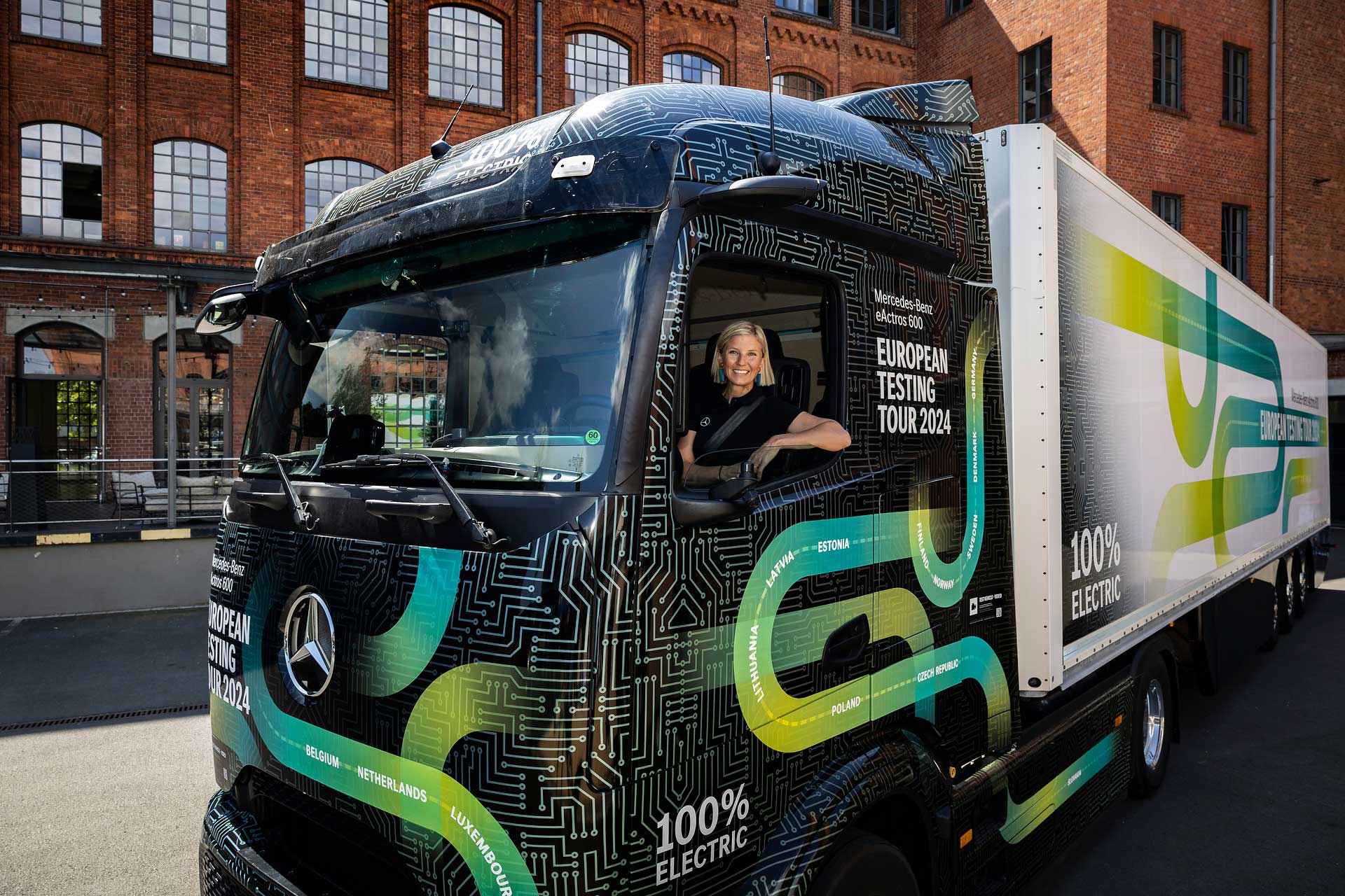 One of two near-series prototypes of the new electric flagship Mercedes-Benz eActros 600 which are traveling across Europe as part of the “eActros 600 European Testing Tour 2024”.