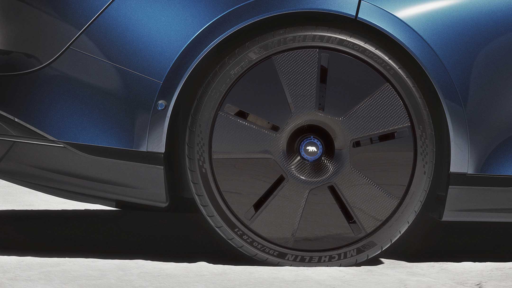 As jantes (20 polegadas na dianteira e 21 na traseira) com pneus Michelin PS4S possuem capas aerodinâmicas removíveis em fibra de carbono.