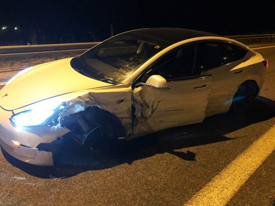 Os danos no Model 3 são bem aparentes do lado esquerdo, com as rodas e painéis da carroçaria muito modificados.