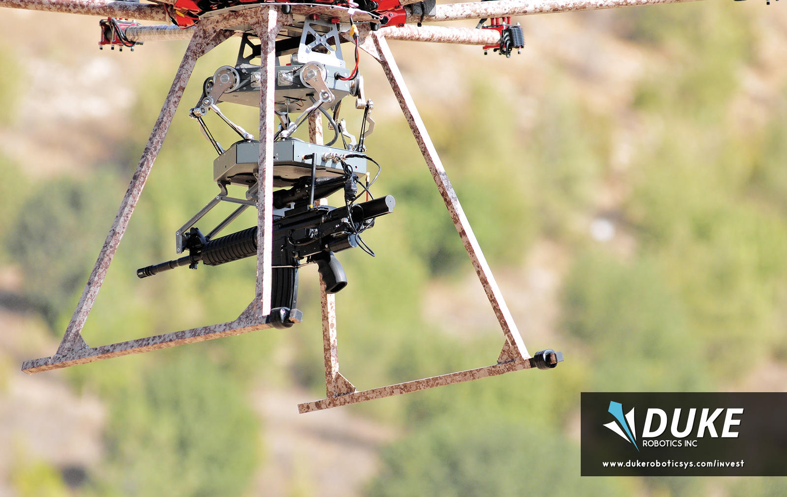 Quando uma arma é disparada, produz um recuo natural, uma reação à força explosiva do disparo, que faz a própria e quem segura nela recuar. Num aparelho voador como um drone, isto reduzir seriamente a possibilidade fazer disparo múltiplos sobre o mesmo alvo. Um eixo cardã ajuda a manter a arma estabilizada, embora não consiga eliminar completamente o “coice” do disparo.