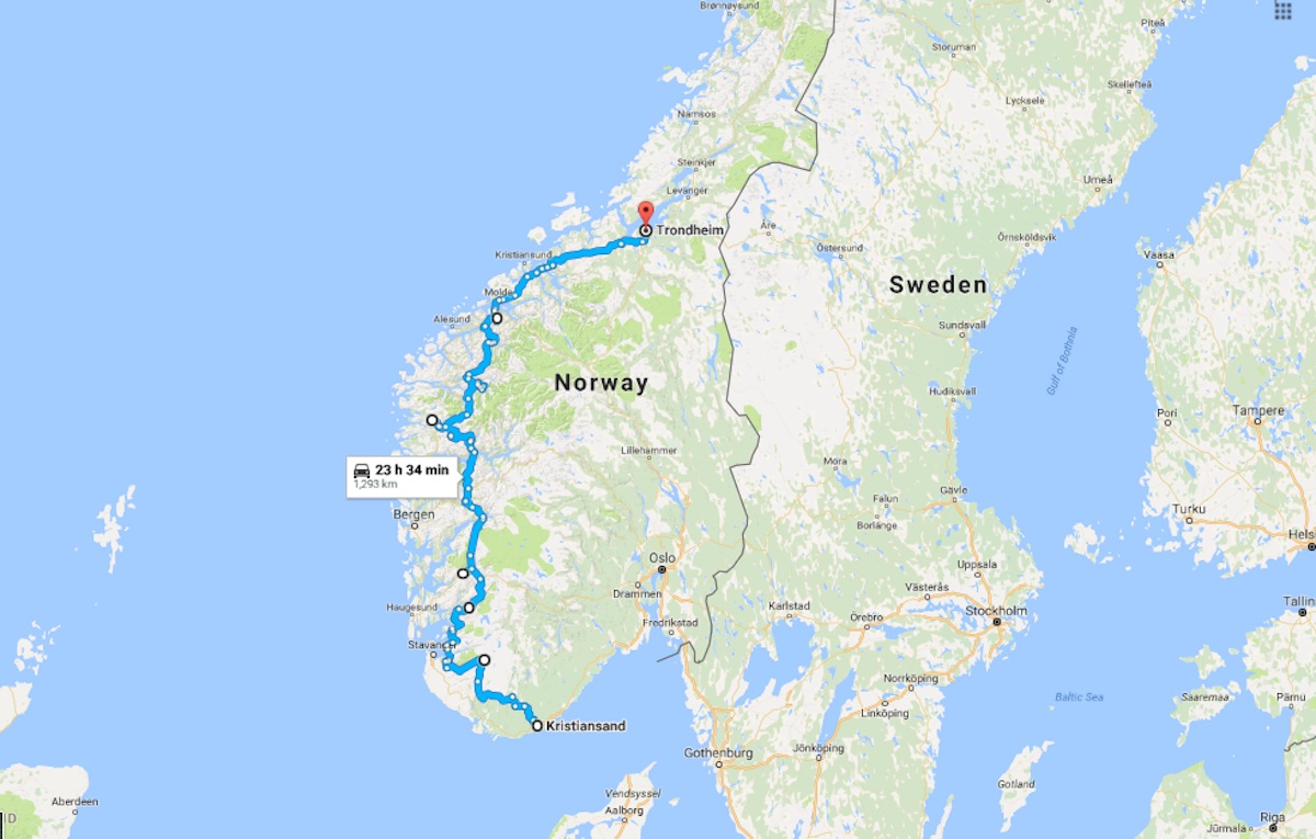 Mesmo assim, é preciso fazer passar carros por aquela zona. Atualmente, fazer a viagem de Kristiansand a Trondheim demora 21 horas a completar, e obriga a usar nada menos que sete barcos, num total de quase 1300 km. Ir por Oslo e Lillehammer não é alternativa. A alternativa poderá ser um gigantesco túnel flutuante, que poderá dar a volta aos fiordes, sempre dentro de água, e não necessitar que os transportes parem seja pelo que for.