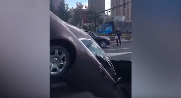 Um Rolls-Royce Ghost foi engolido por um buraco na estrada, na província de Heilongjiang, na China. Parado no semáforo, assim que a luz verde apareceu o condutor prosseguiu a marcha… nesse instante a estrada abateu.…