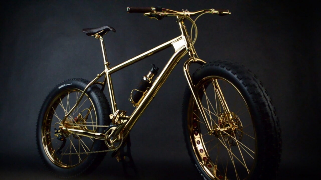 Conhecida apenas como ‘Gold Fat Bike’, a bicicleta desenhada por Hugh Power, um dos principais obreiros das criações mais excêntricas da House of Solid Gold, empresa que se dedica a fabricar versões em ouro maciço dos objetos mais insuspeitos de todos os dias, tem direito a designação mais pomposa.