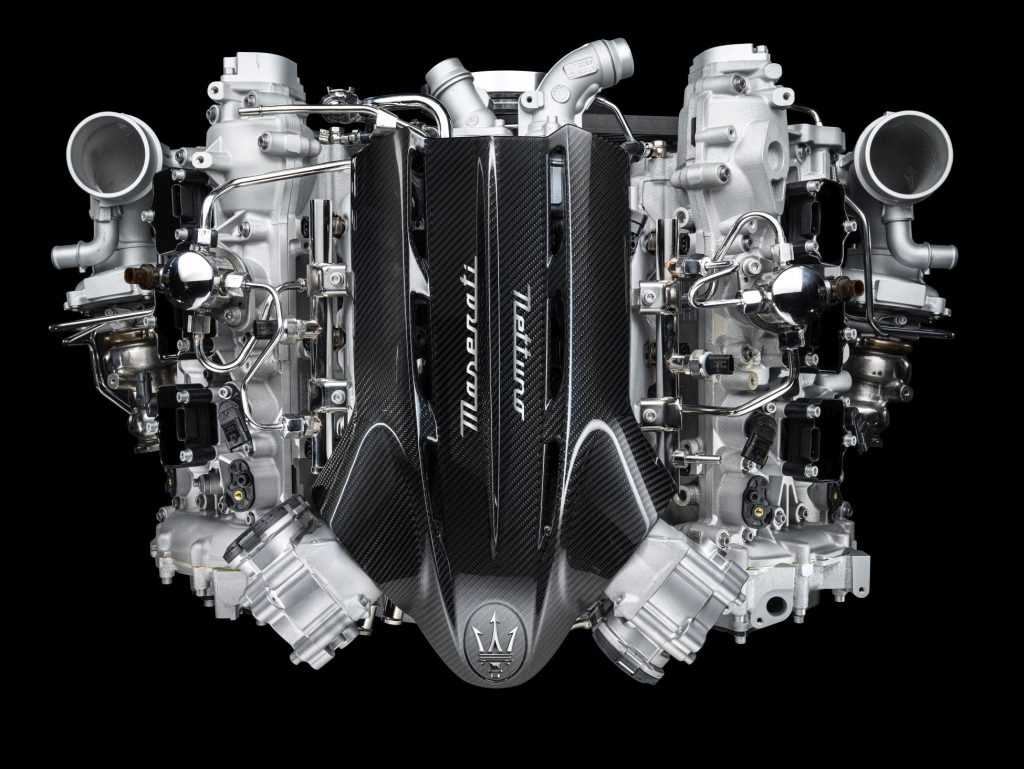 Para este novo motor, a Maserati recorreu a uma unidade com arquitetura de seis cilindros em ‘V’ num ângulo de 90 graus, com 3 litros de cilindrada, dois turbos e sistema de carter seco, tradicional entre os superdesportivos. No total, debita 630 CV às 7500 rpm e 730 Nm de binário logo às 3000 rpm, com uma relação de 201 CV/litro.
