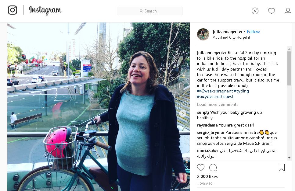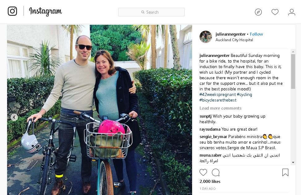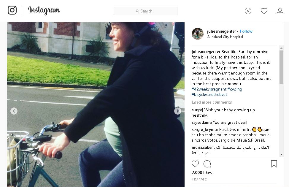 Julie Anne Genter, que é também membro do Partido Verde neo-zelandês, estava grávida de 42 semanas e decidiu ir na sua bicicleta elétrica até à maternidade do hospital da cidade de Auckland, onde acabaria por ser mãe pela primeira vez, aos 38 anos de idade.
