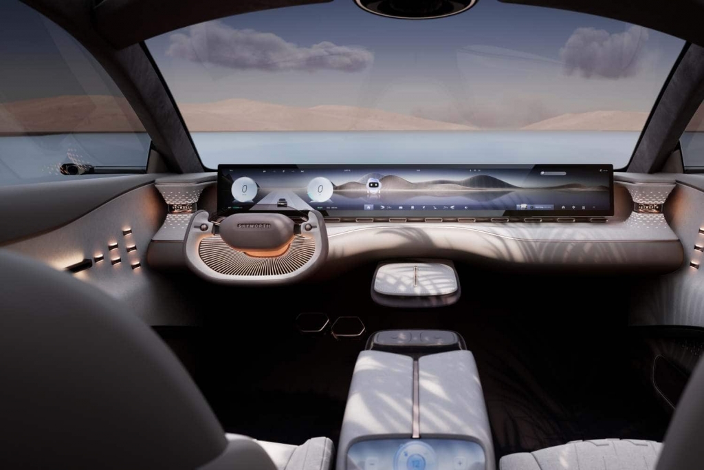 A Skyworth também investiu fortemente no desenvolvimento da suspensão e afirma que o novo elétrico possui o sistema pneumático mais avançado do setor, com uma configuração dianteira de duplo braço triangular e um eixo traseiro de cinco braços em liga de alumínio, com uma relação de carga dos eixos dianteiro e traseiro de 50:50, perfeitamente equilibrada.