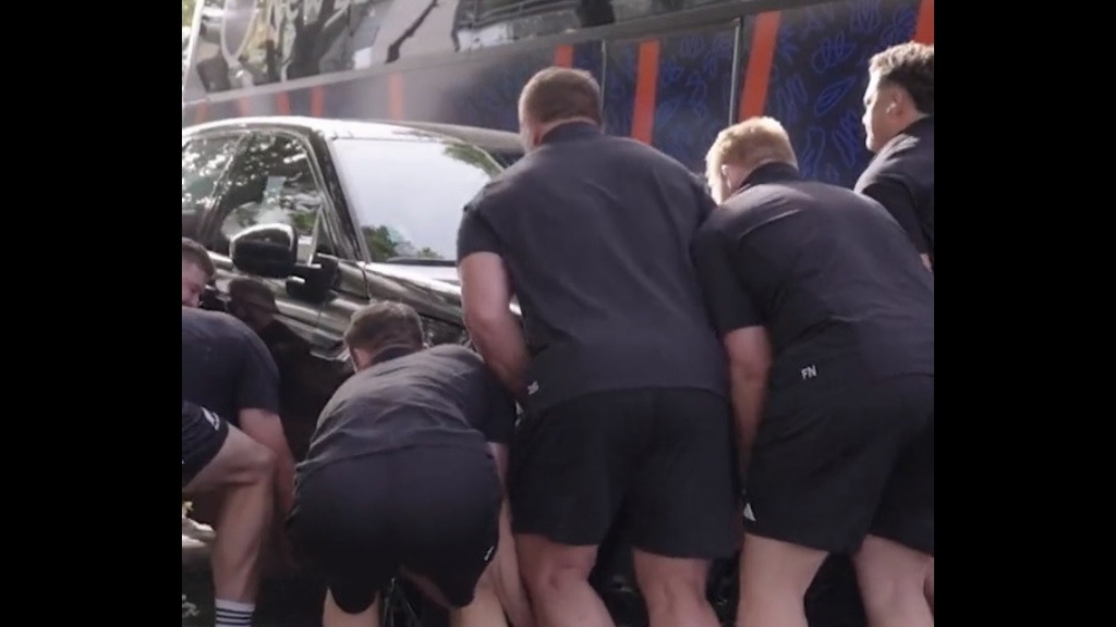 E, em mais uma demonstração do seu inatacável espírito de equipa, uniram esforços para levantar no ar um Land Rover Discovery que estava a bloquear a passagem ao autocarro da equipa, em preparação para a semifinal do Mundial da modalidade que se está a disputar em França.