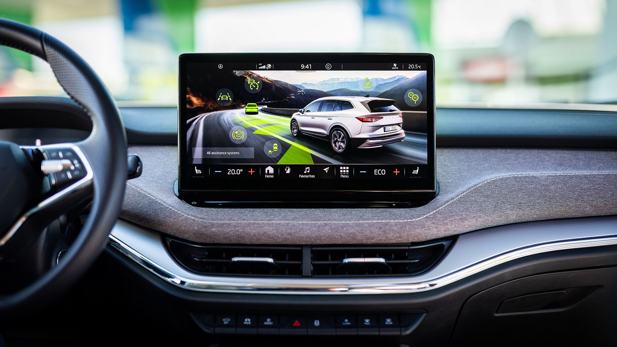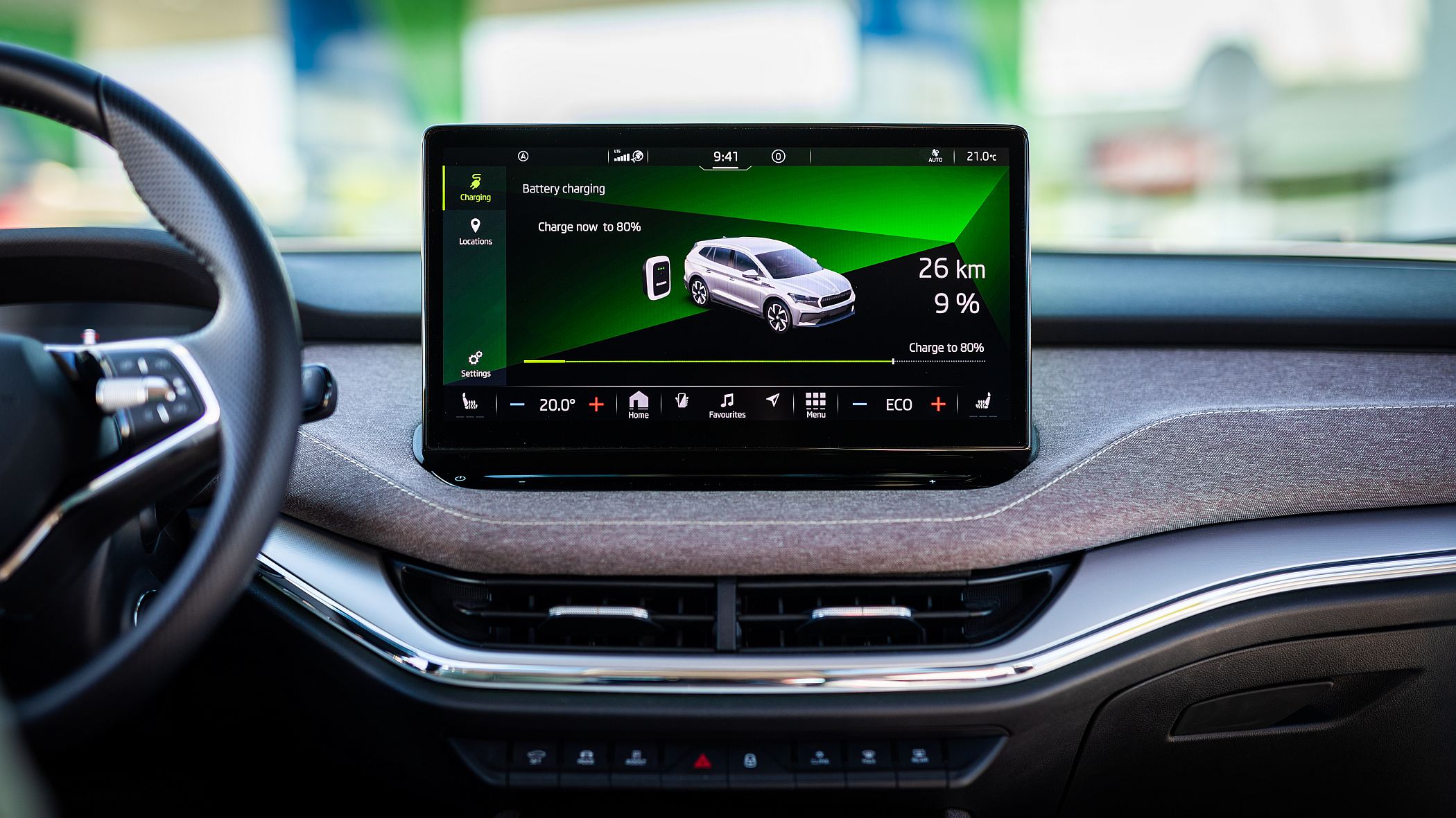 Há também um novo modo de gestão de bateria que pode ser ativado a partir do ecrã central e que assegura que a bateria não é carregada até ao seu máximo, limitando o processo de carregamento até aos 80%, o que beneficia a longevidade desse componente a longo prazo. No entanto, garante Jaromír Mendl, do departamento de marketing de produto do Enyaq iV, o cliente pode escolher o carregamento completo a 100% caso assim pretenda, bastando assinalá-lo no ecrã central. Depois de carregar a 100%, o modo volta a limitar o carregamento a 80%, sendo assim uma função por defeito.
